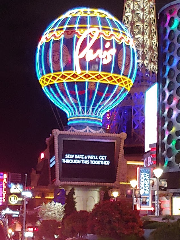 There were many casino signs with positive messages wishing the community wellness and safety during the closures. Most casinos kept normal lighting on, but a few were completely dark. The hotels that kept lights on did not beam with the normal brightness because of all the dark hotel rooms. The Strip was gloomy, just as you would expect it to be right now.