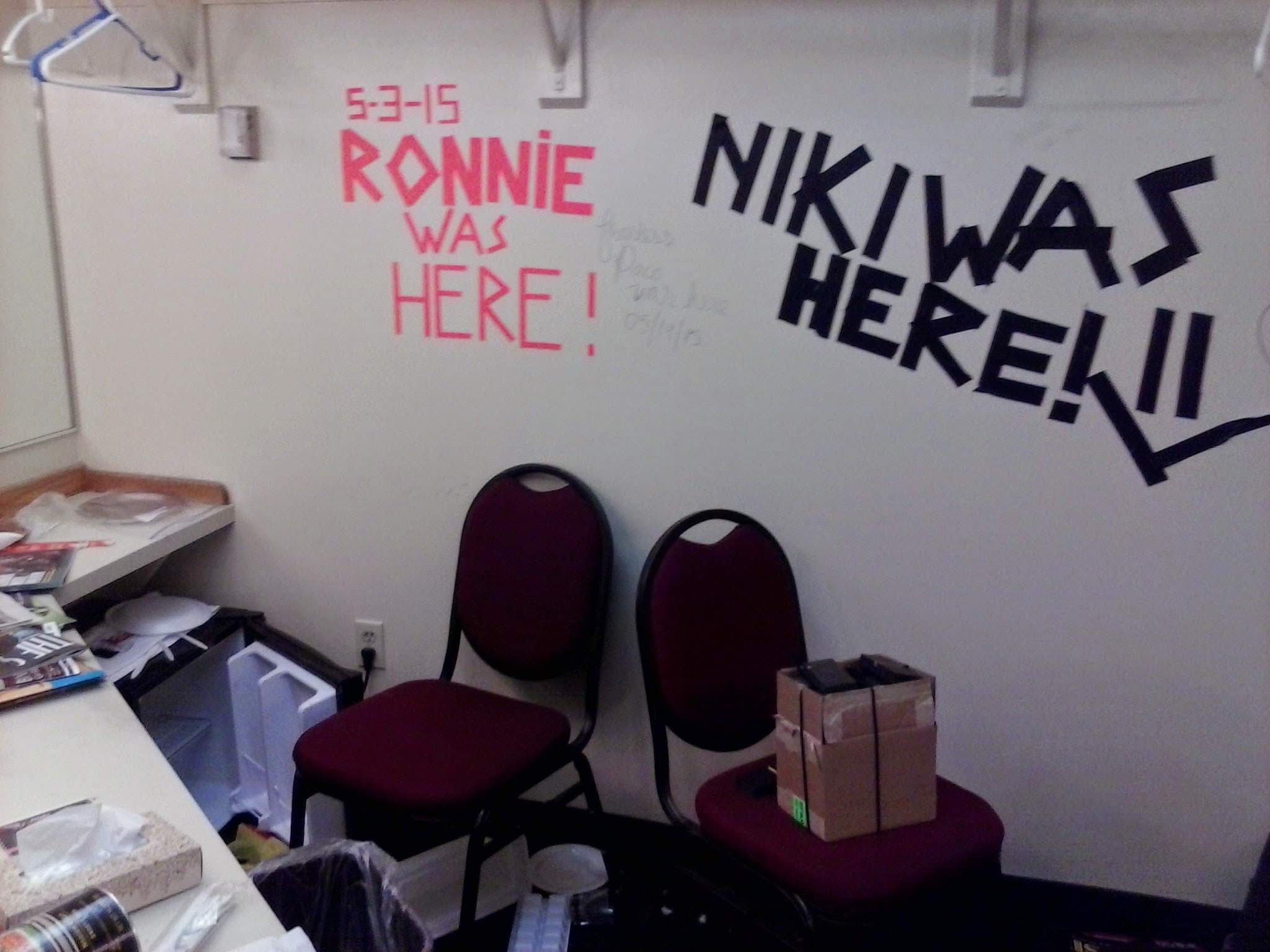 - Friendly “graffiti” on a green room wall inside the Riviera during its liquidation sale on May 23, 2015.