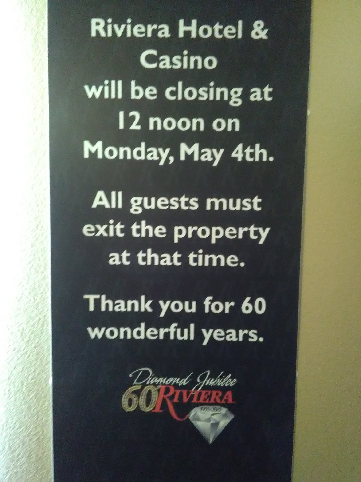 - Posterboard sign states “Riviera Hotel & Casino will be closing at 12 noon on Monday, May 4th” and more.